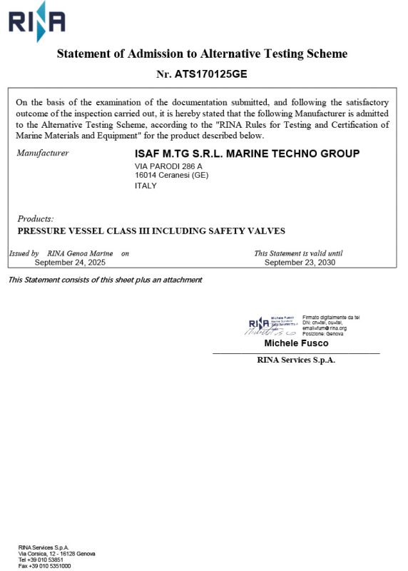 L’intero ciclo produttivo, orientato all’assoluta assicurazione di qualità, è certificato secondo le norme ISO 9001:2015. Il livello di qualità e l’esperienza maturata hanno permesso all’azienda di acquisire il riconoscimento da parte del RINA di costruttore con collaudo fiduciario.